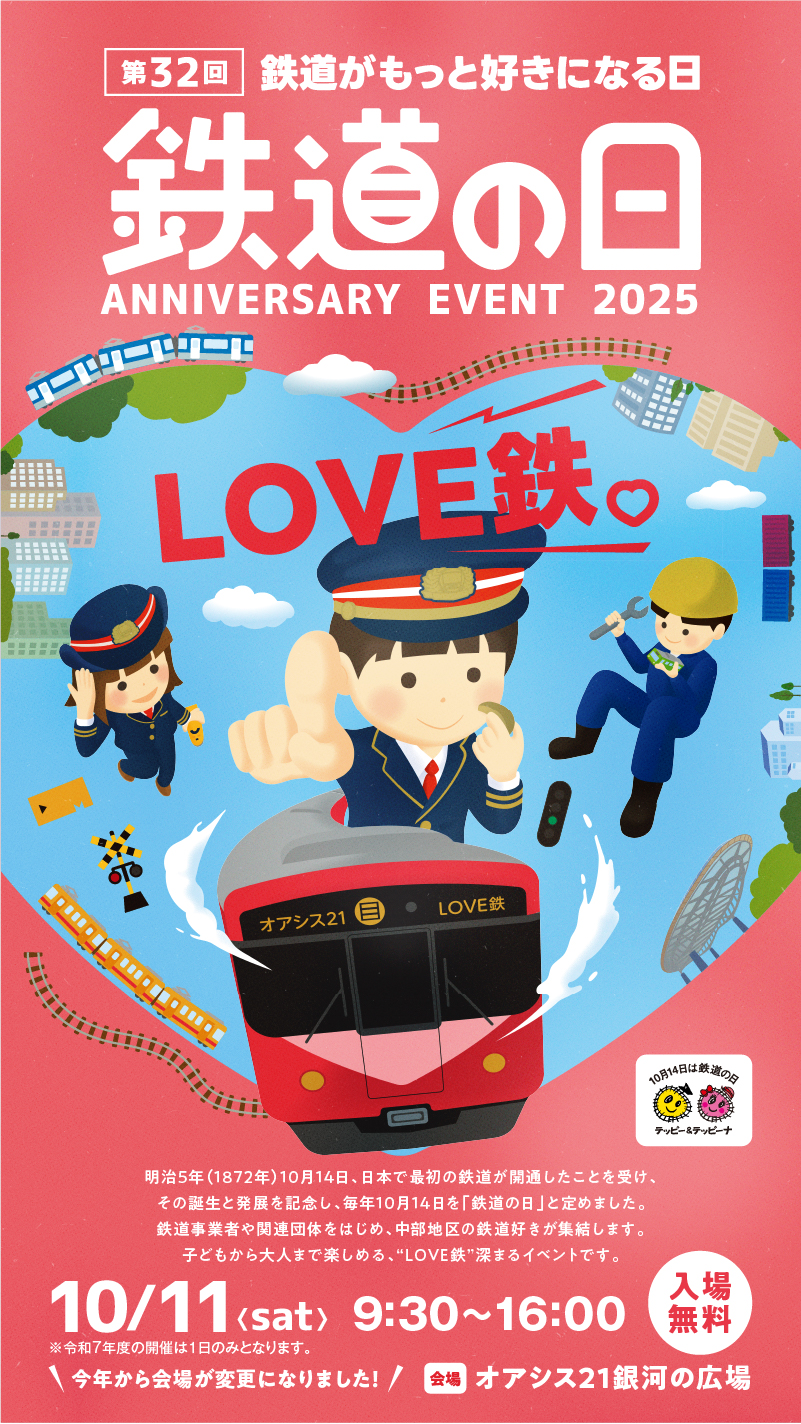 2025/09/01 イベント 『鉄道の日記念イベント2025』出展のお知らせ 中部地区最大の鉄道イベント!!鉄道の日記念イベント2025 に出展します開催日程:2025年10月11日(土)物販時間:10:00~16:00 場 所:オアシス21銀河の広場 入場無料※今年から会場が変更になりました。樽見鉄道ブース:・オリジナルグッズ販売・鉄道部品販売・イベントPR(お品書きは10/1(水)より順次公開予定) PREV 一覧へ戻る NEXT